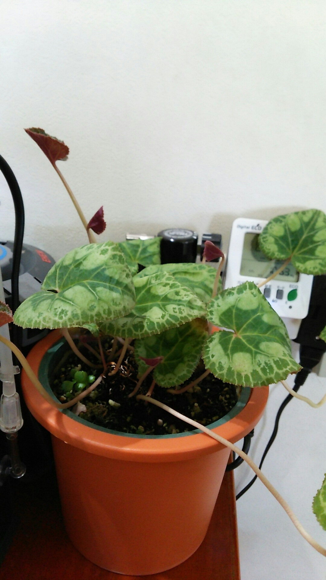 水槽の脇に、フィルターやボンベ、配線類を隠す目的で置いてあるシクラメン。。。