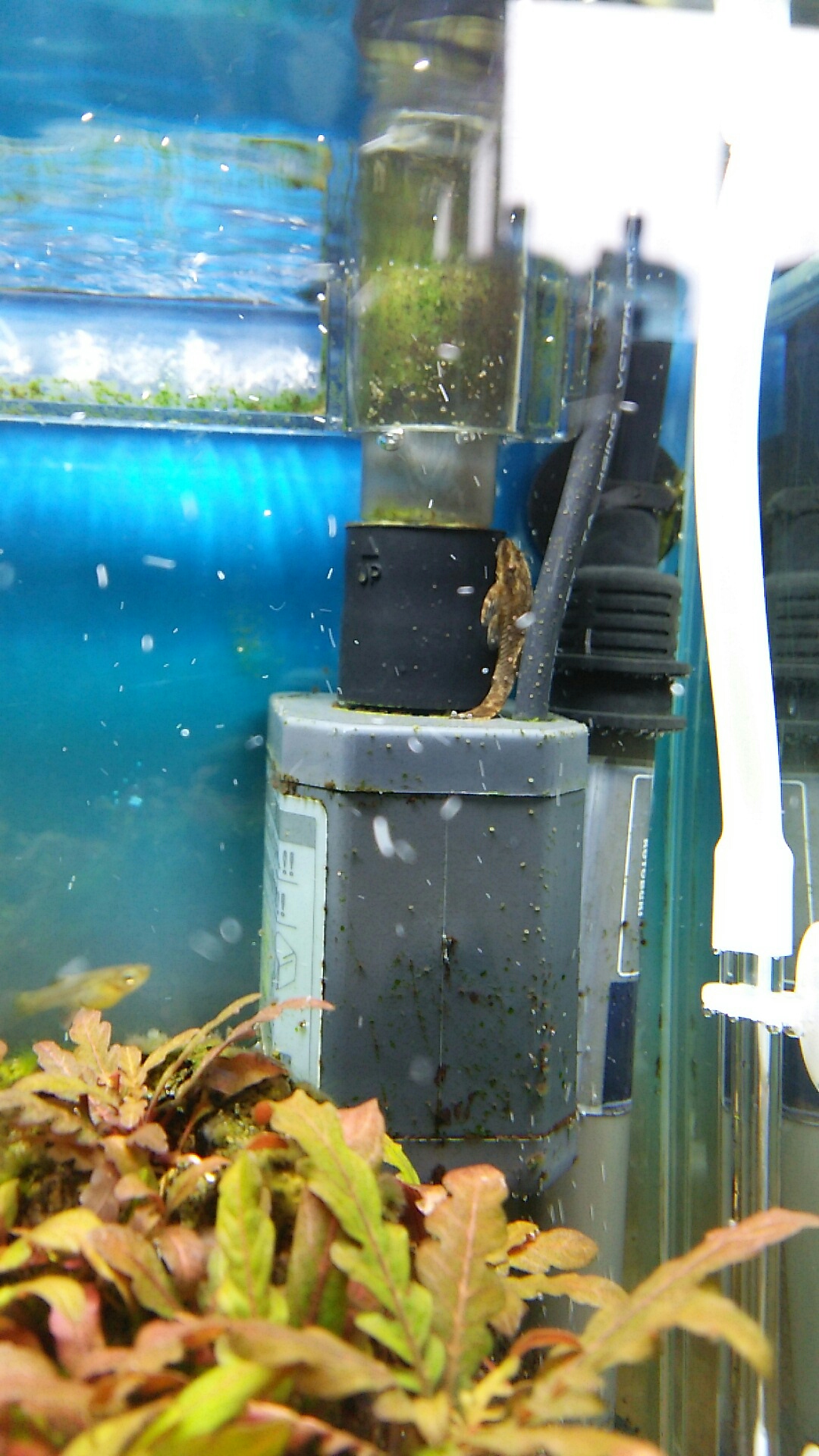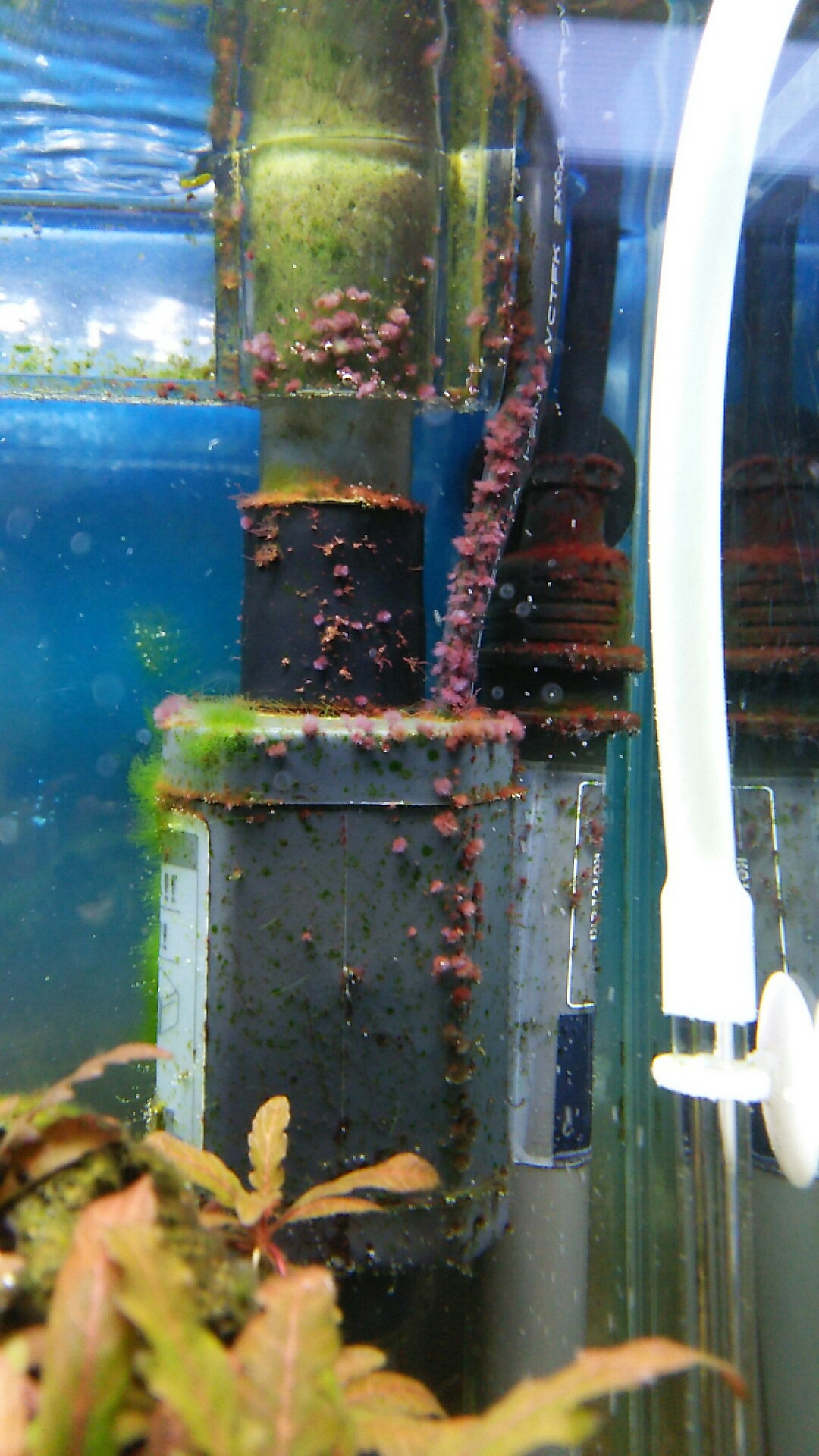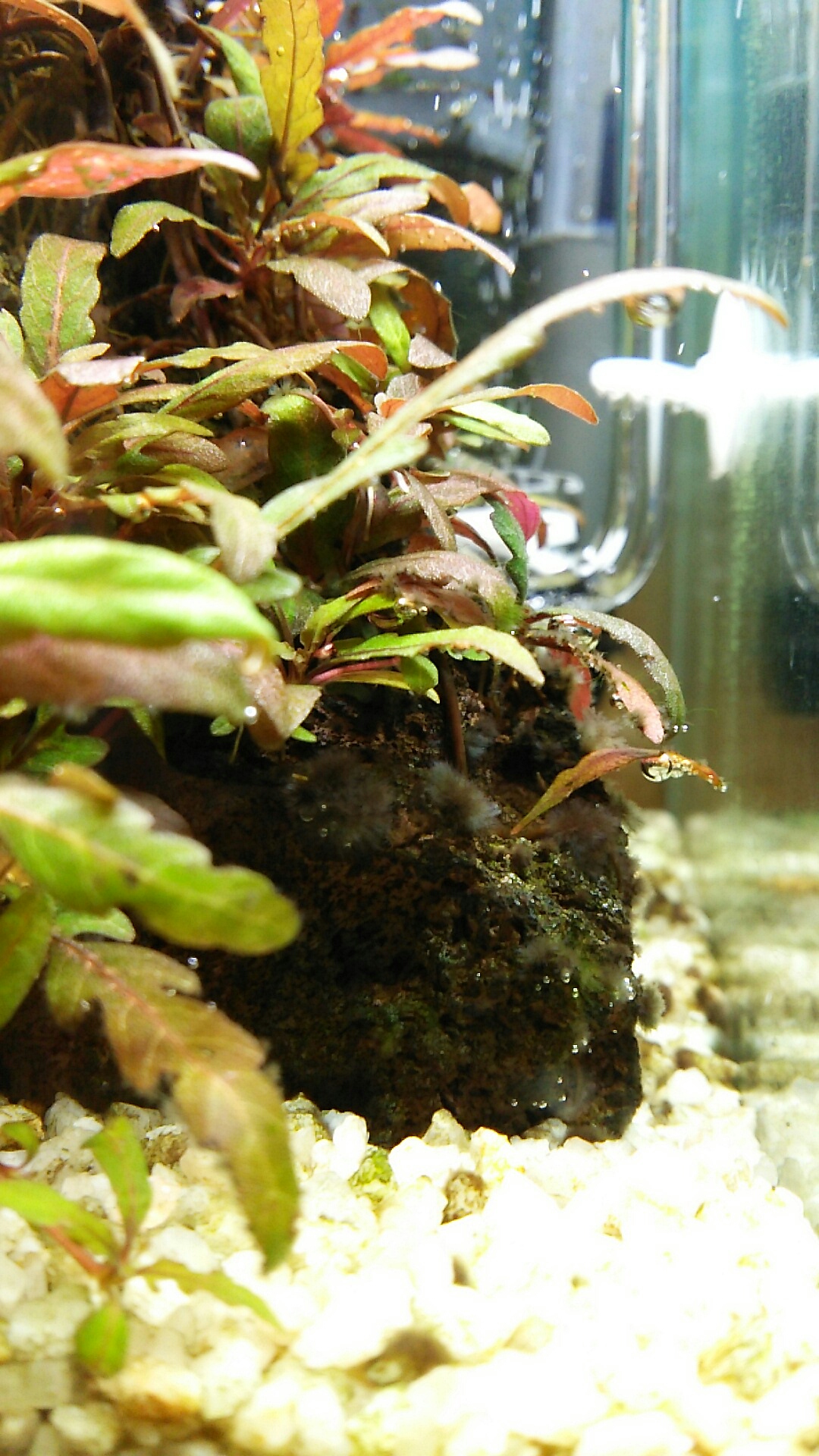 30cm水槽の外掛けフィルターの排水口付近とヒーターで黒髭さんが繁殖してましたので、換水ついでに木酢液を塗っておきました✨