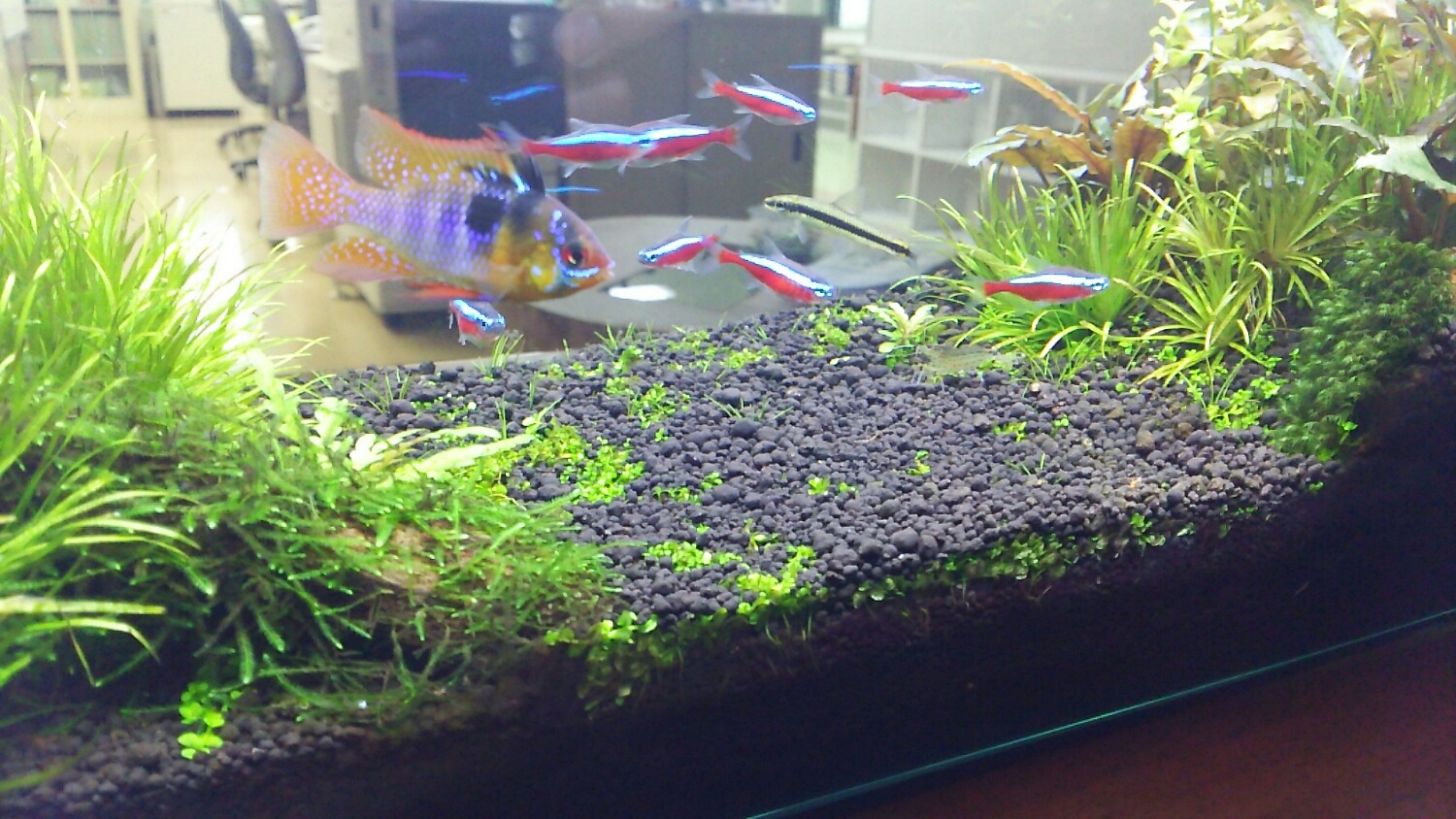 水槽の右側のソイルが厚くなってて見苦しいので、水槽の前に流木を置いてみました✨