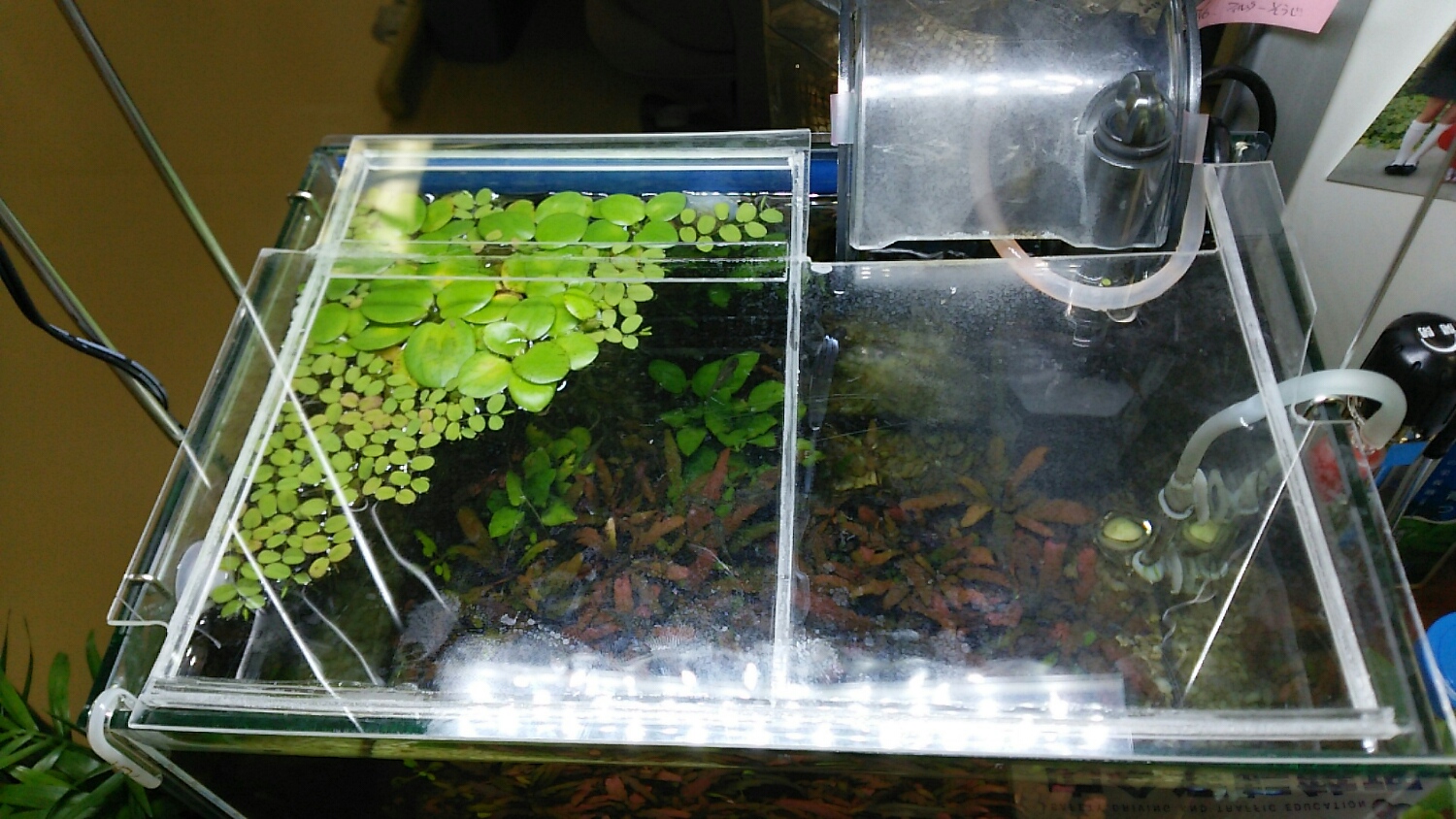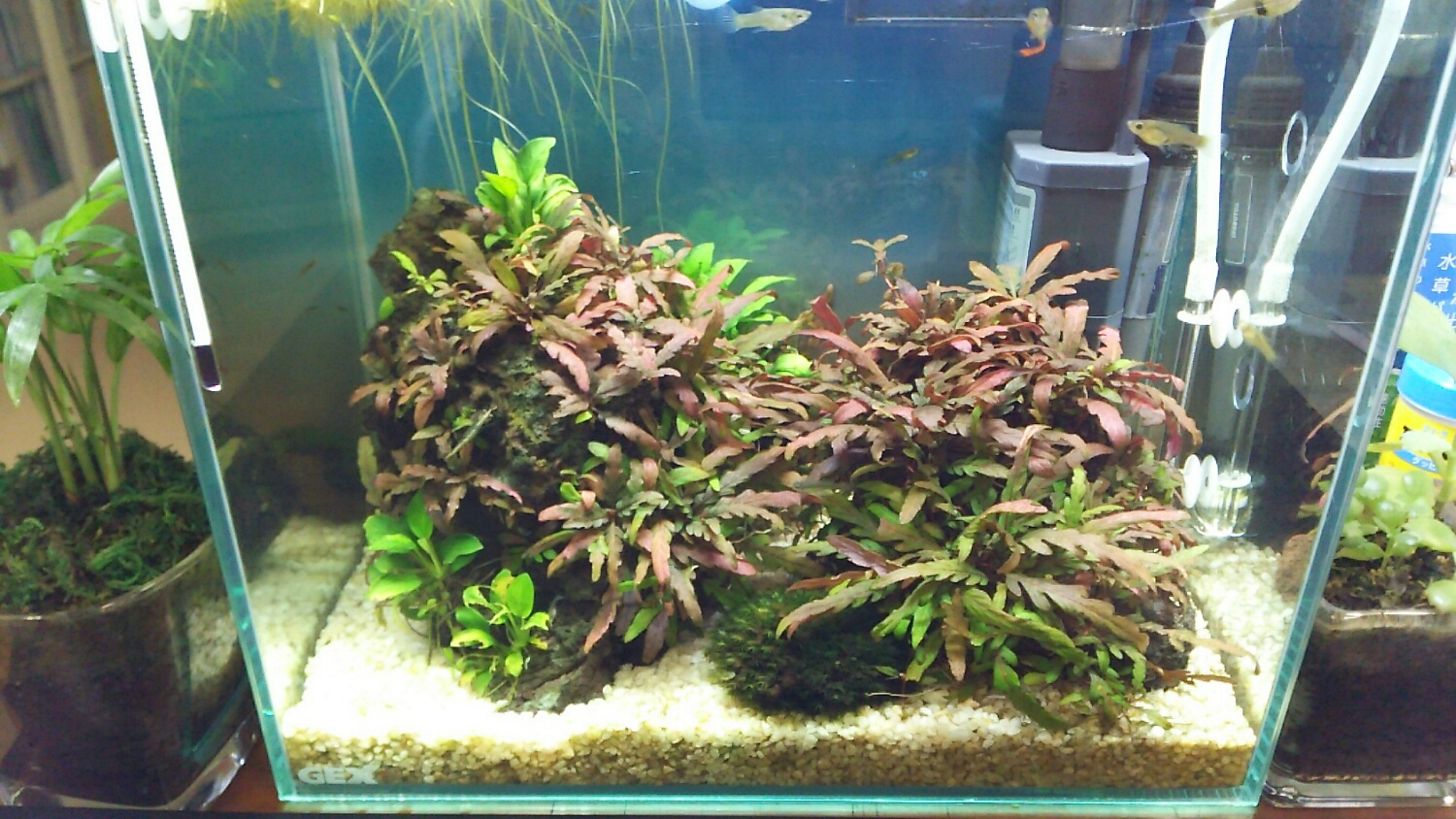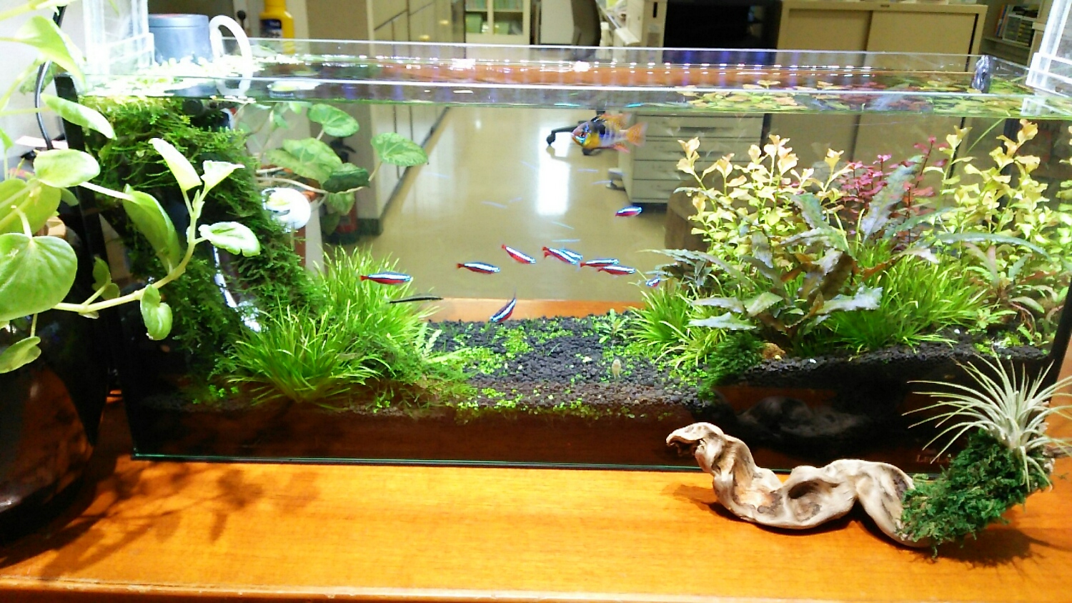 続いて、自分のデスクにある30cm水槽を覗きこむ。