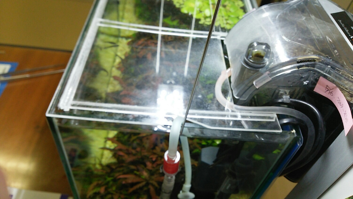 カウンターにある60slim水槽のガラス蓋を外し、エアレーション器具を取り外す。