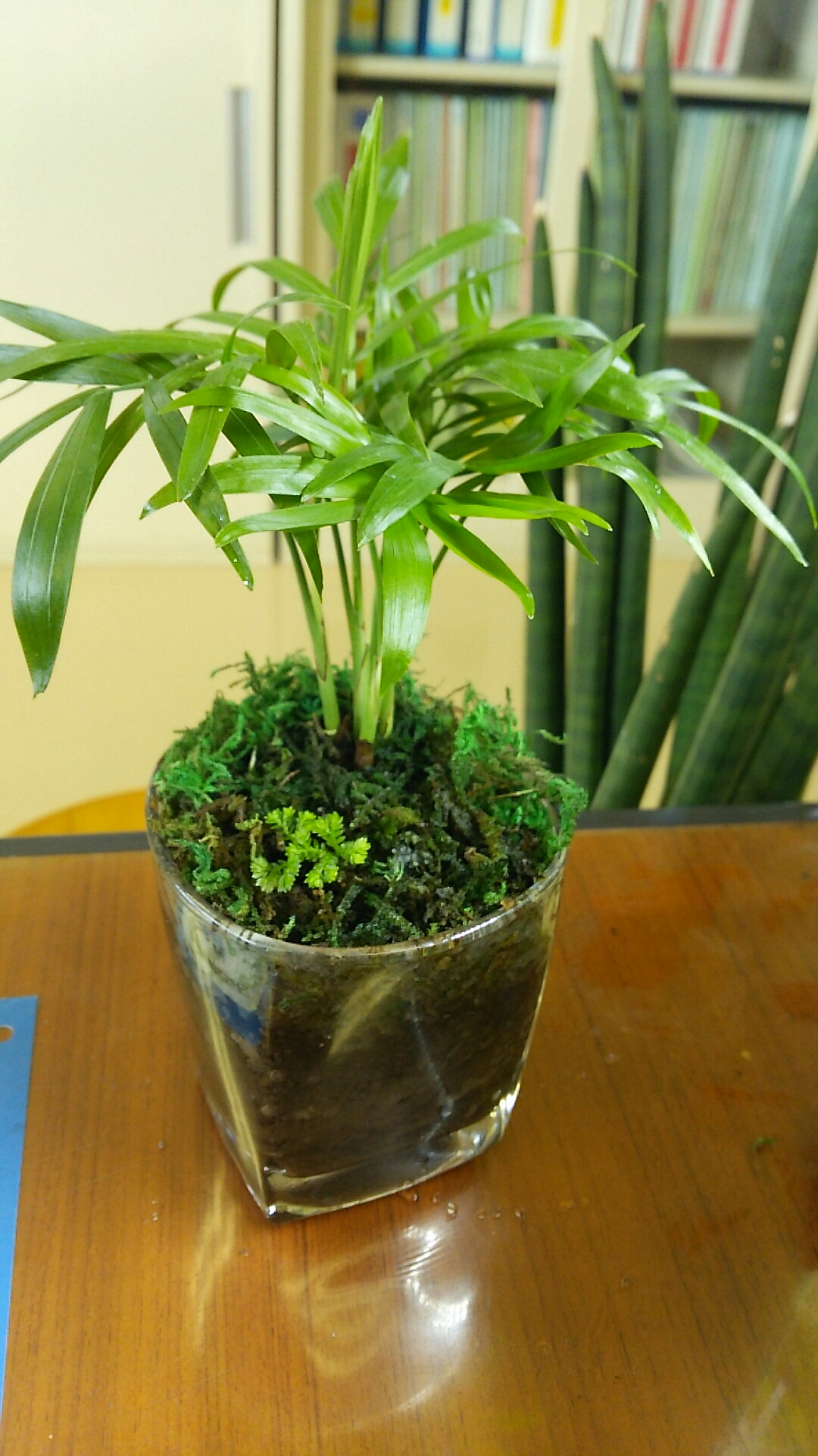 100円ショップのガラス容器に植えたテーブルヤシも、新芽をたくさん出してきてて調子良さげ。。。です!
