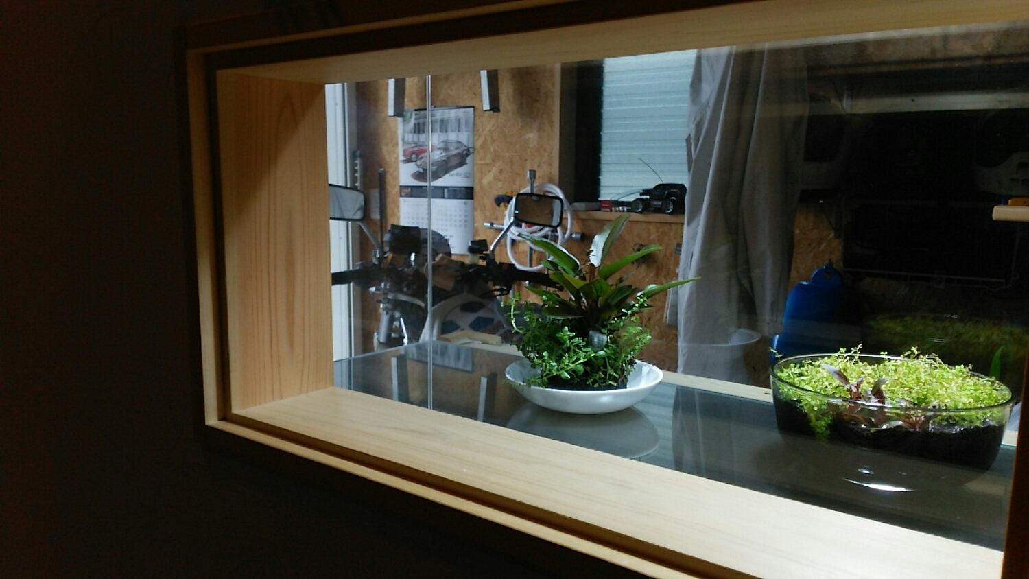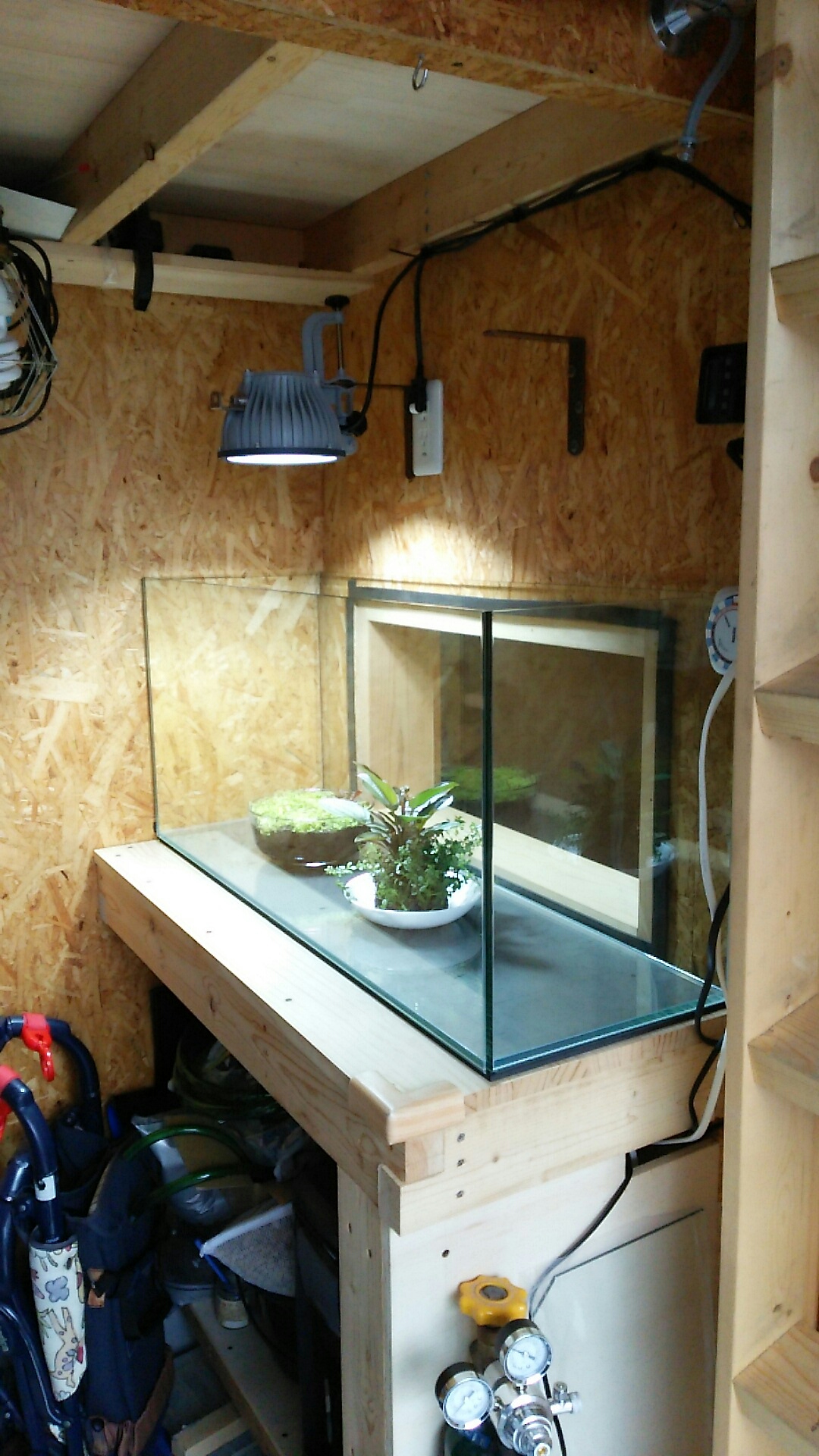 ご覧いただいて解るように、水槽の後ろ側(バイクガレージ兼物置)が丸見えです。