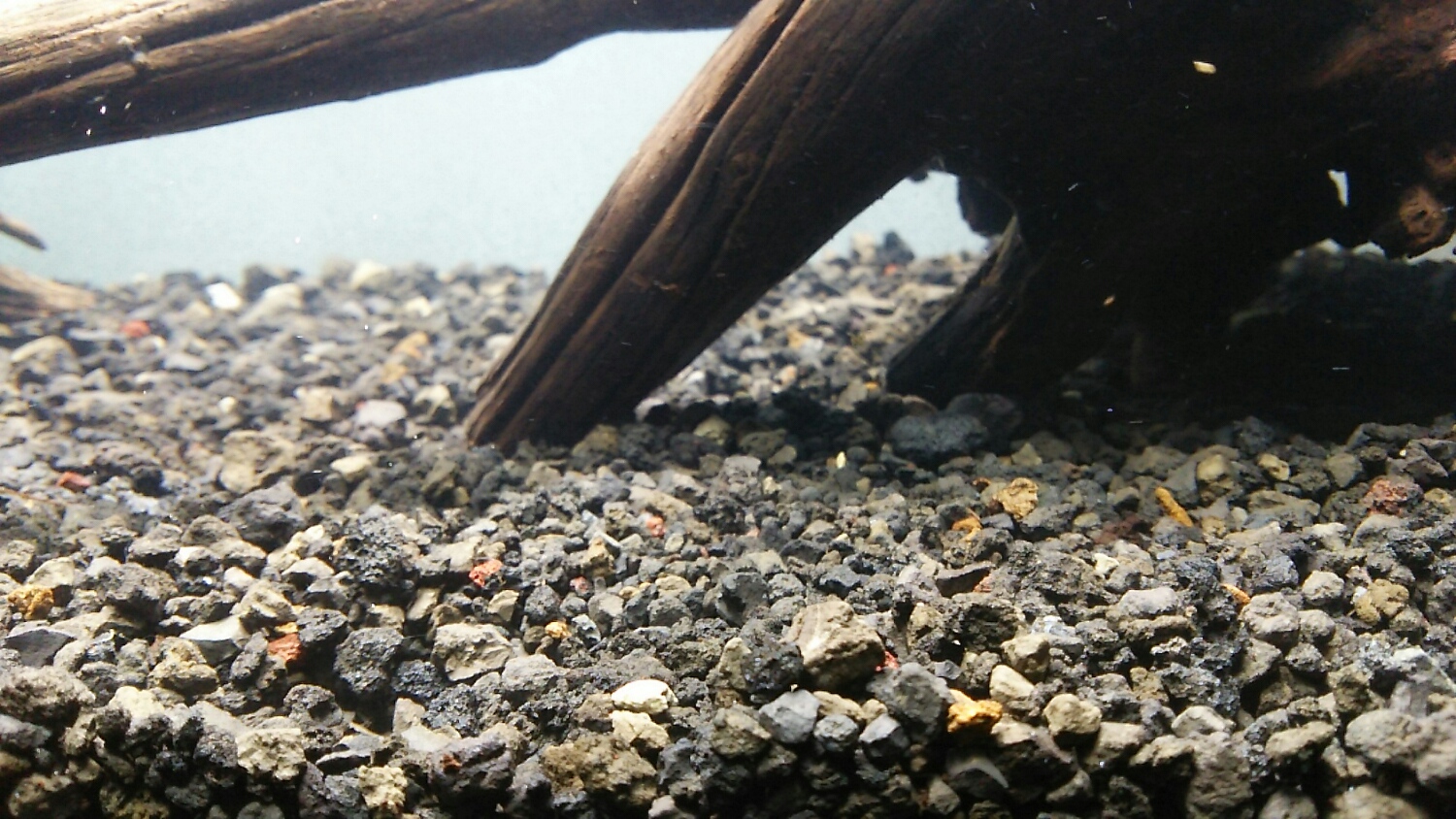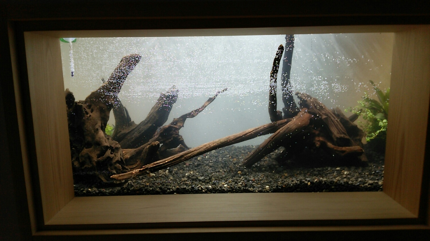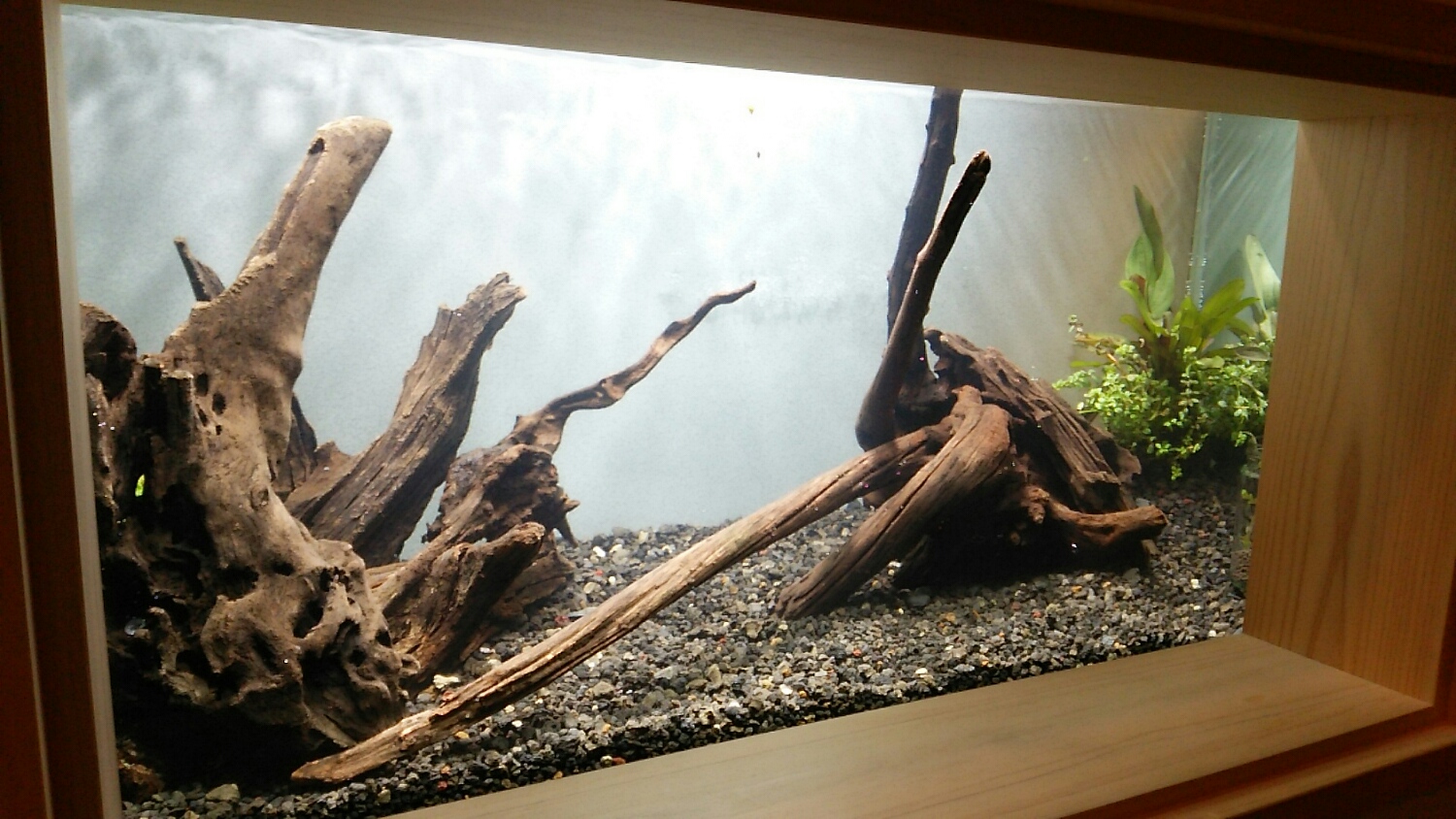 構わず全てを水槽に敷き詰めて、準備しておいた流木を配置!