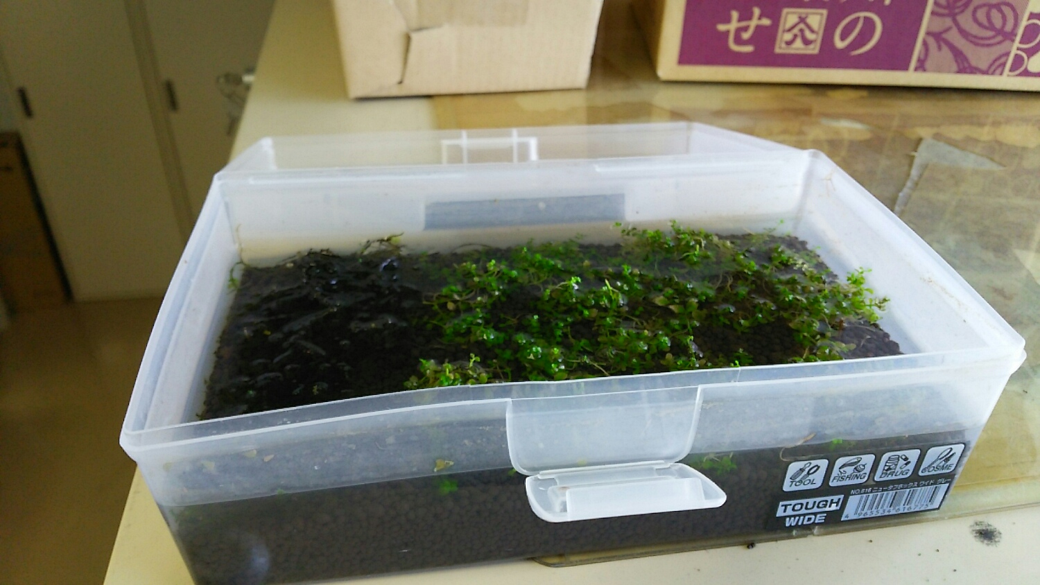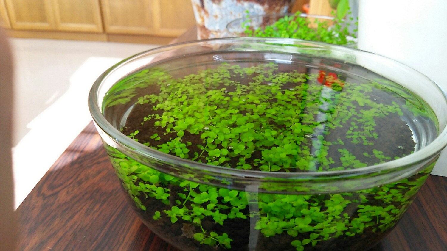 これは、少し大きめのガラス容器に水を貯めて、完全に水中葉として管理しています。。。