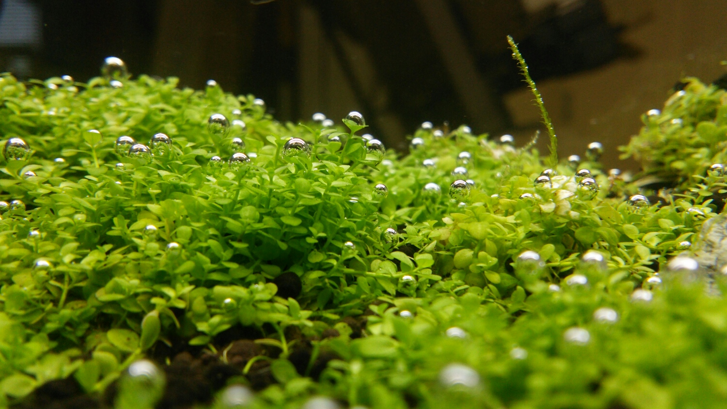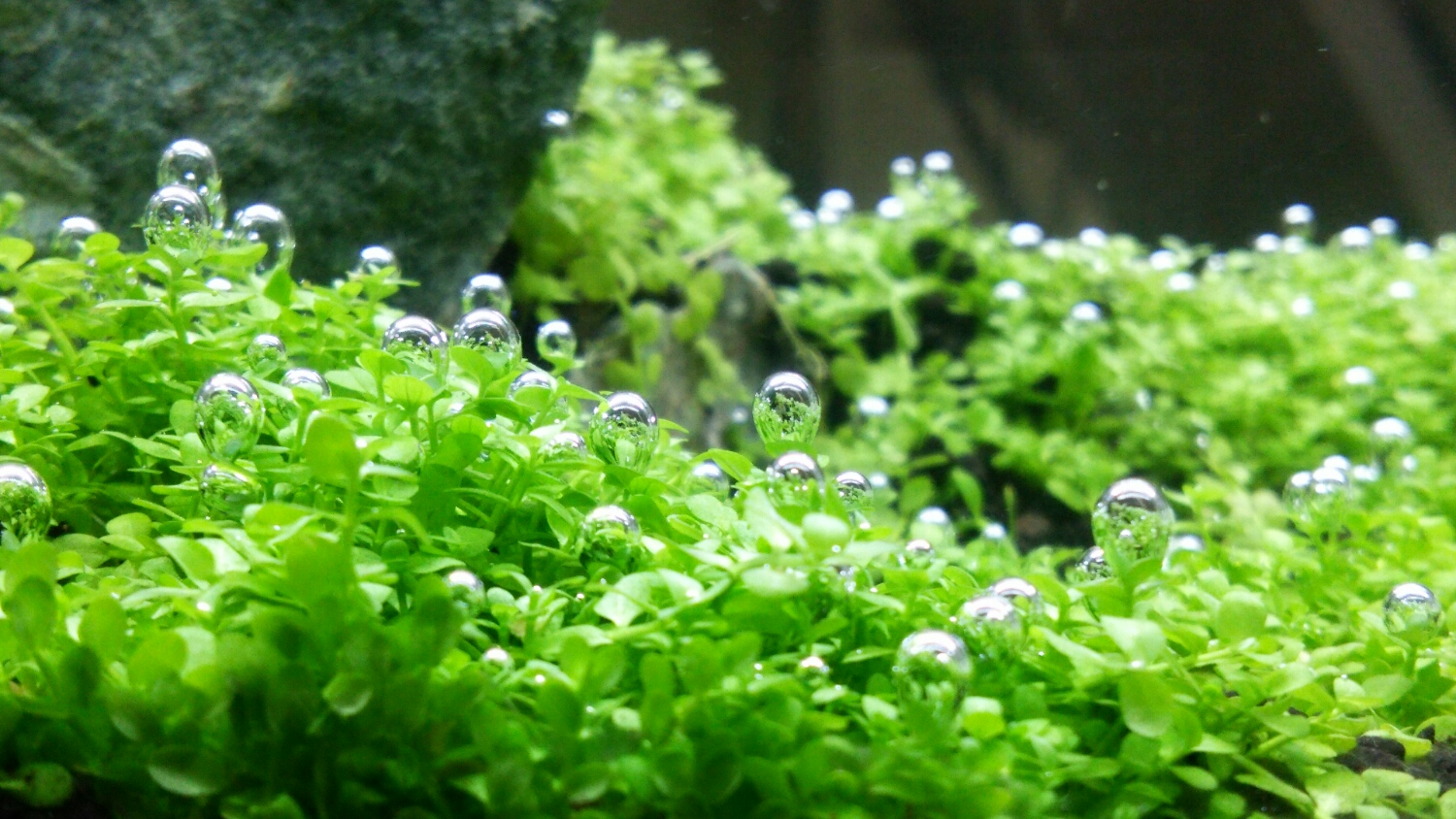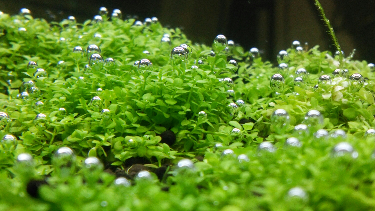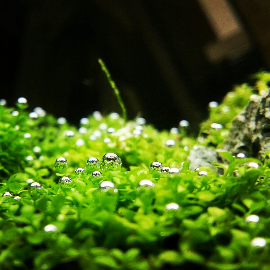 単純に、水草が水中で光合成してできた気泡ではないと思います。
