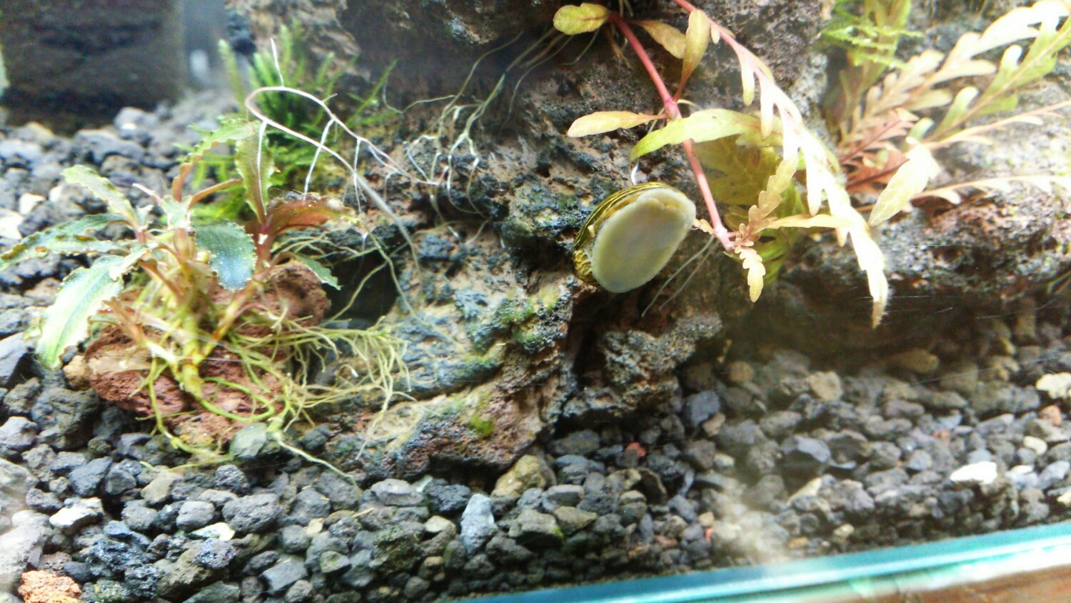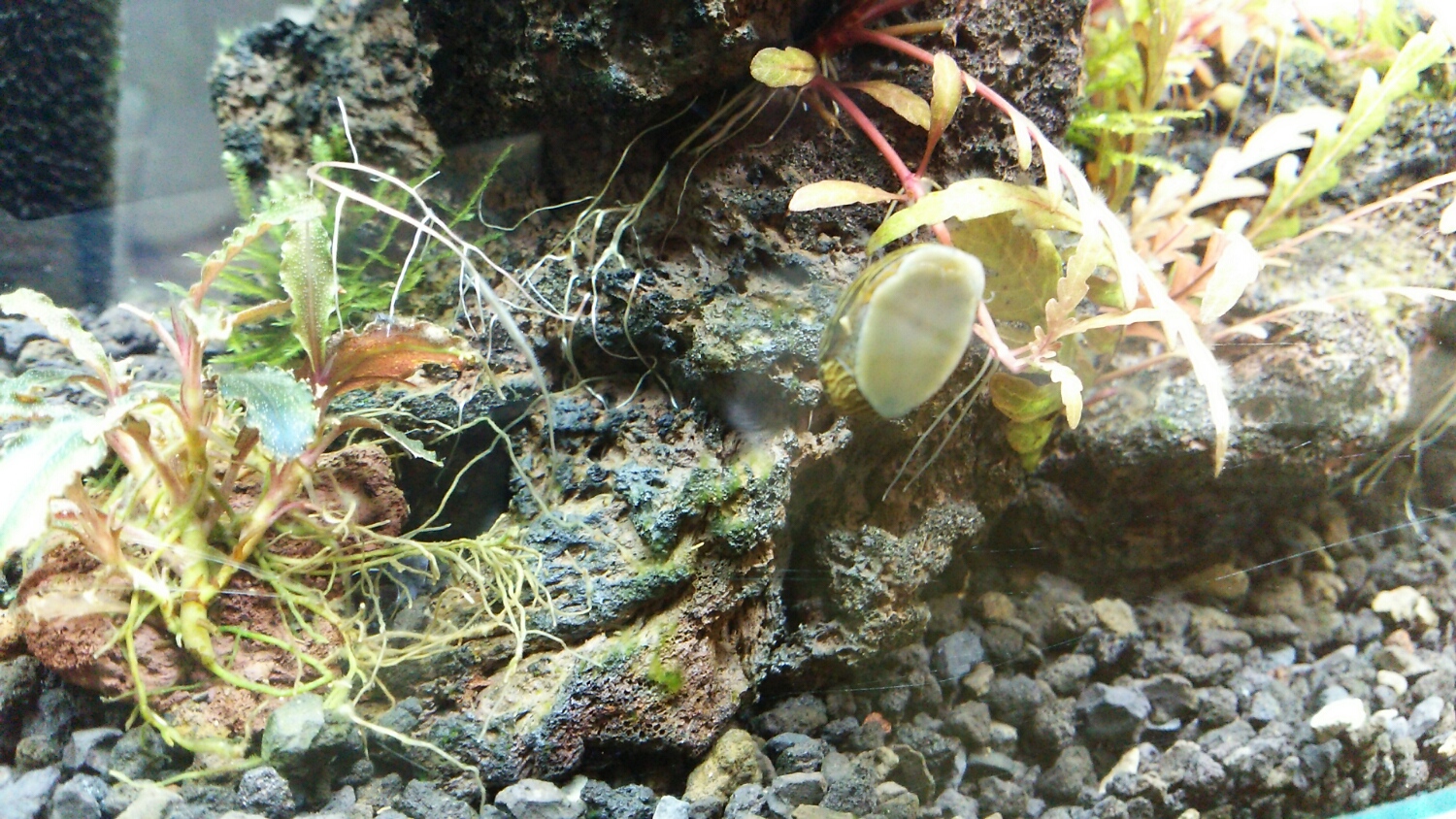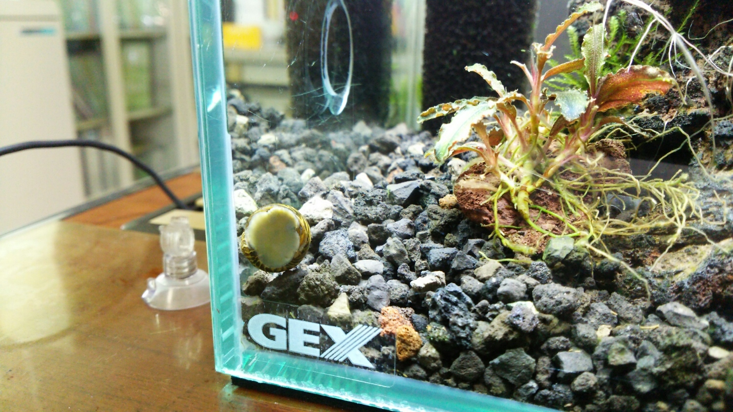 シマカノコガイ君、調べてみたら「脱走の名人」らしいです。でもコケ除去能力は高いとか。一長一短・・・。