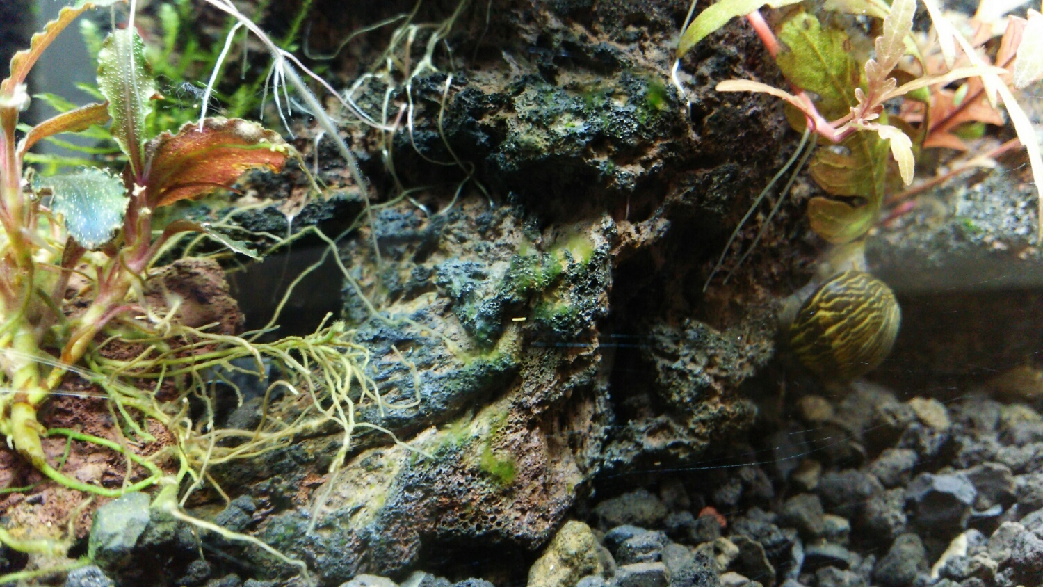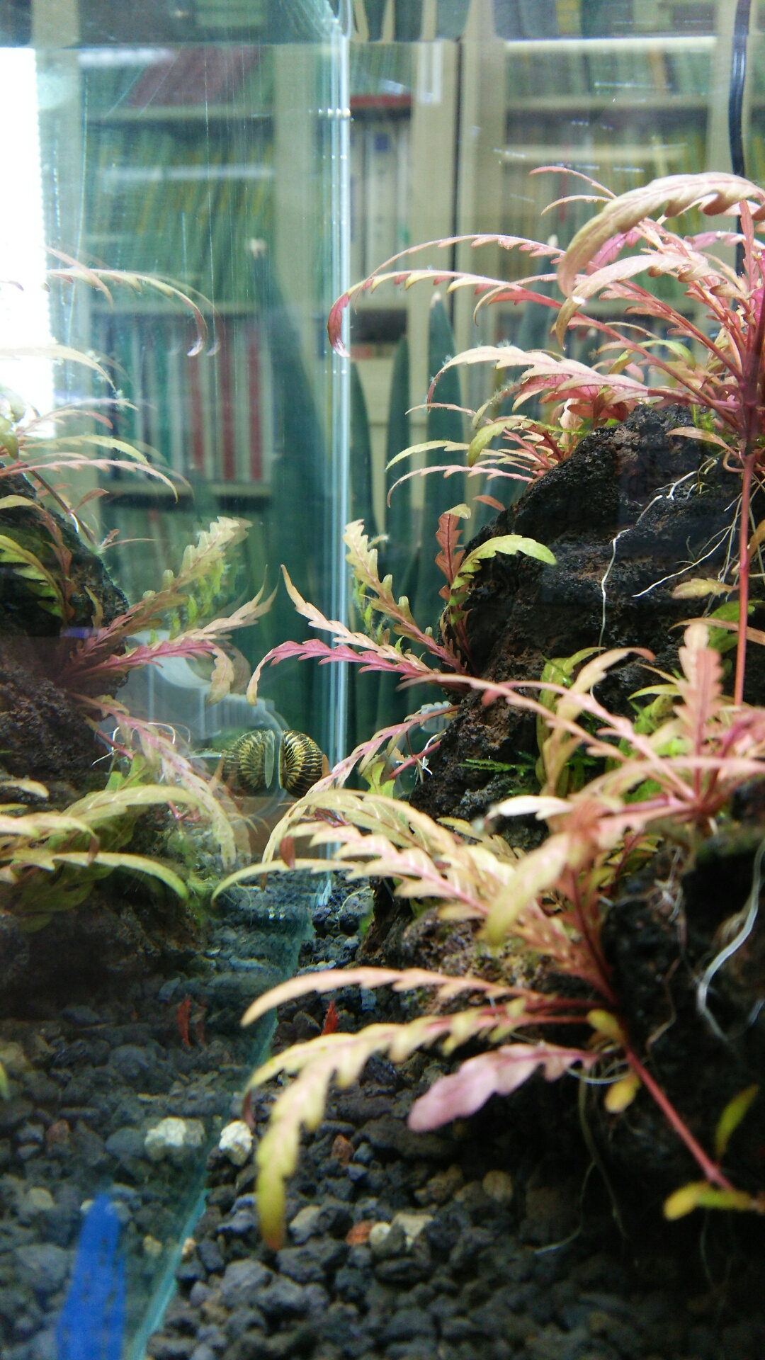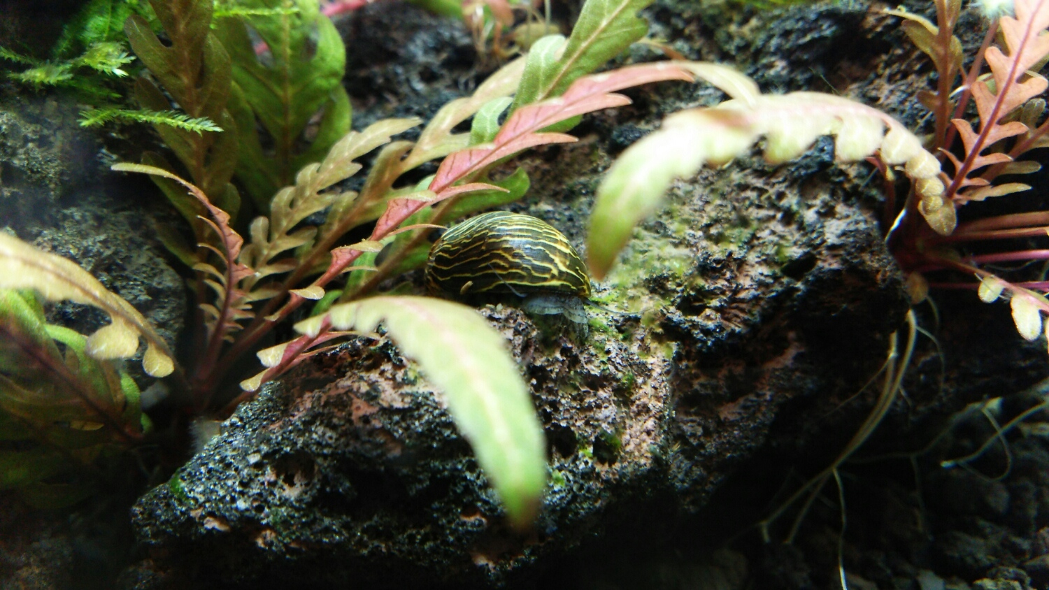 シマカノコガイ君、調べてみたら「脱走の名人」らしいです。でもコケ除去能力は高いとか。一長一短・・・。