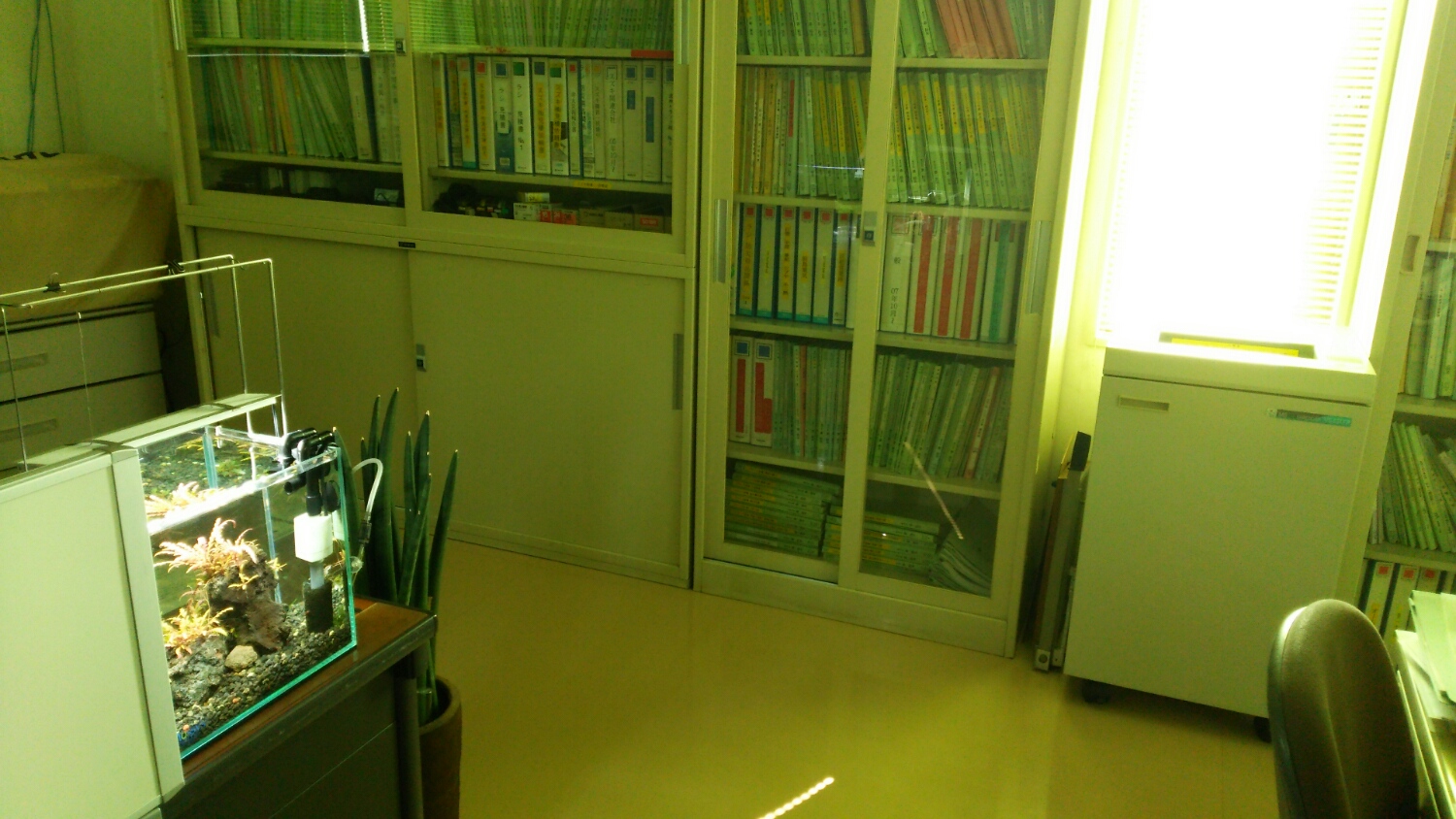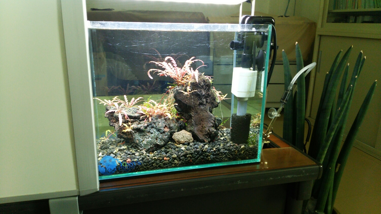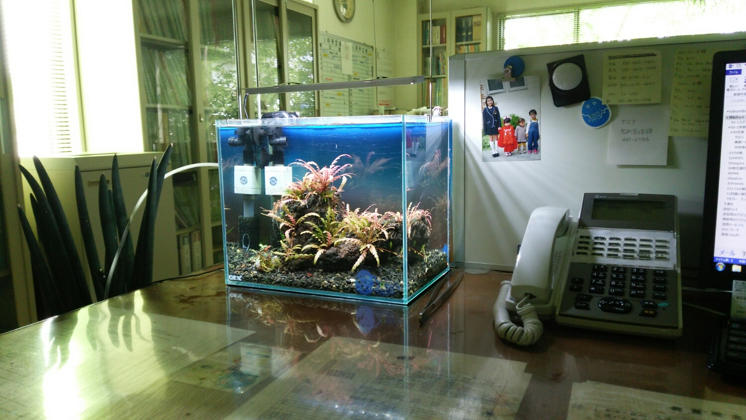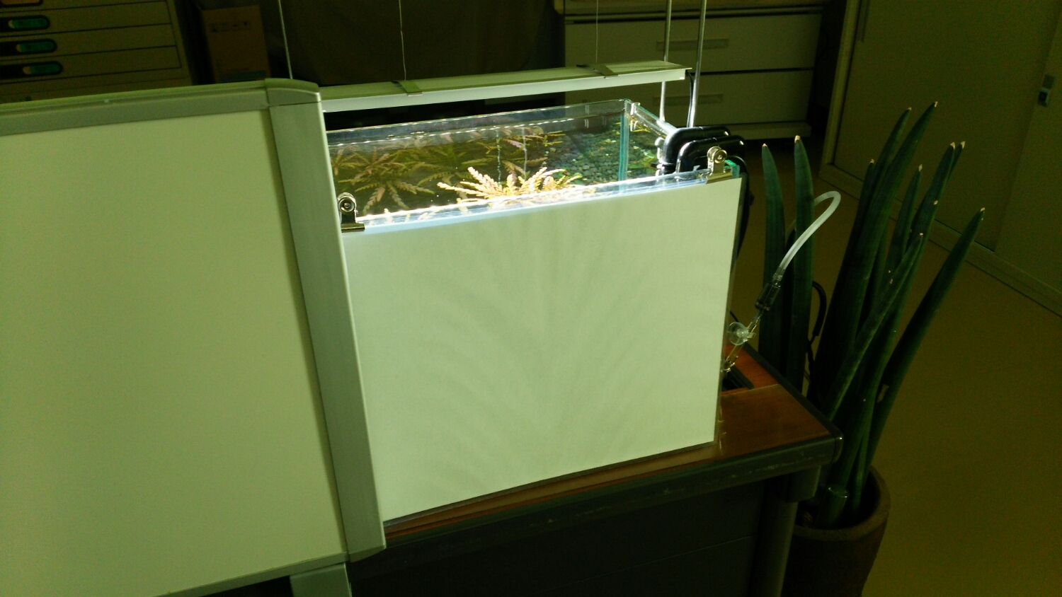 ウチの職場水槽は逆に日光が当たるので、照明を最小にしてますw