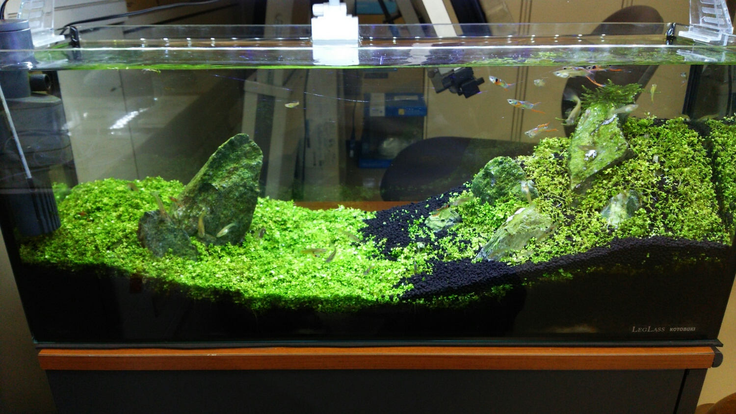 60cmスリム水槽、ニューラージのエンドラーズ水槽も併せて週末完全遮光をしていますw