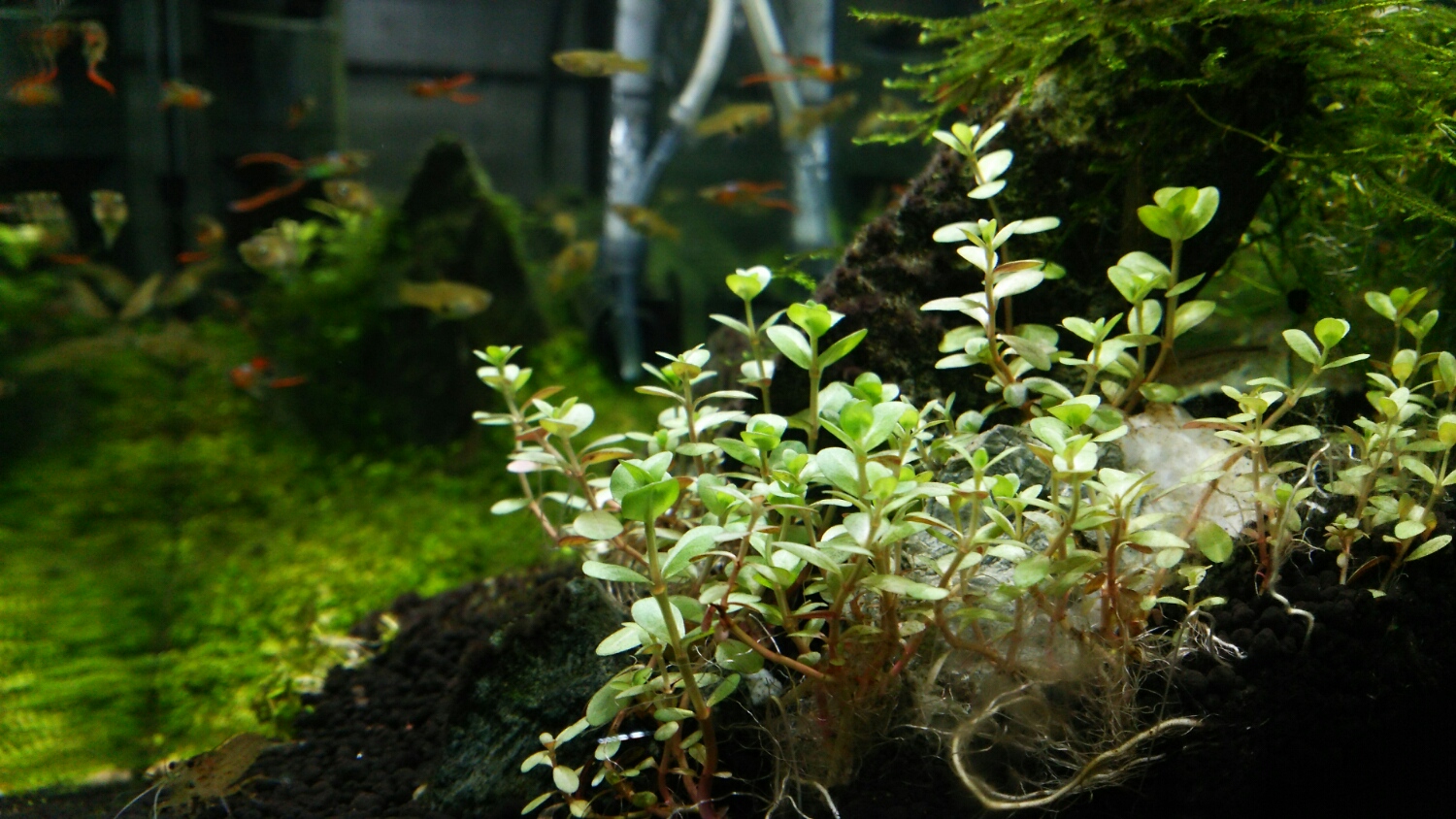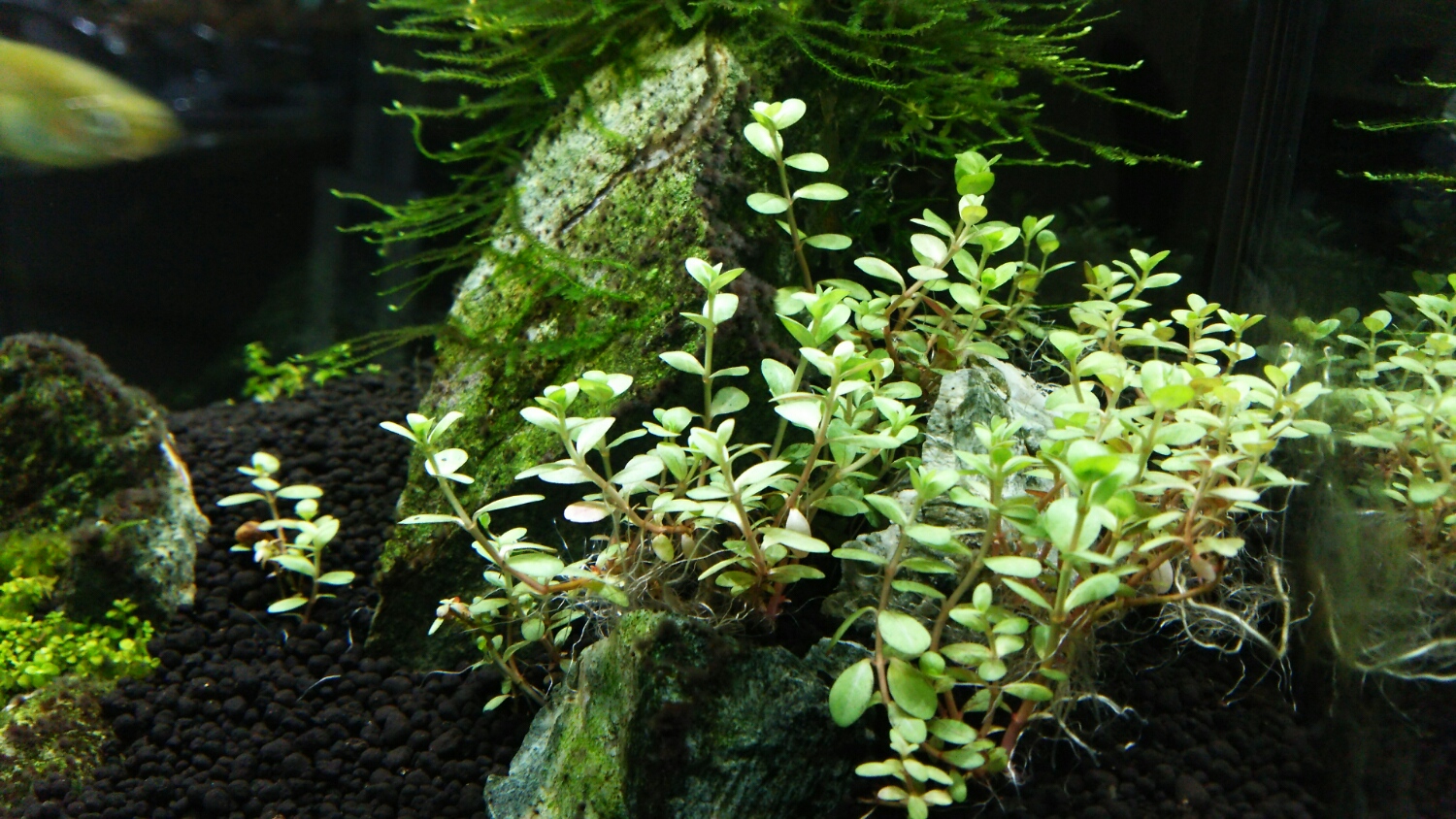 そして、前回の記事で紹介した60slim水槽の一部に植栽しました。