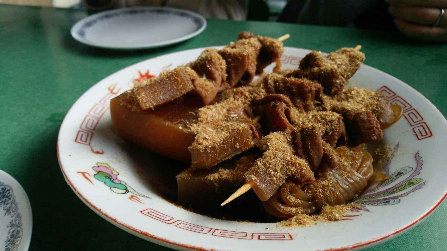 色の濃い出汁でジックリ煮込まれたおでんに、削り粉をトッピング・・・