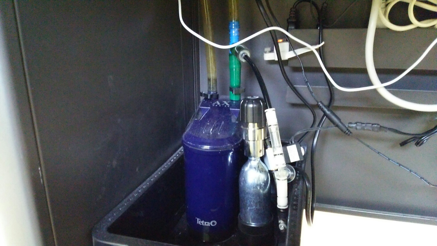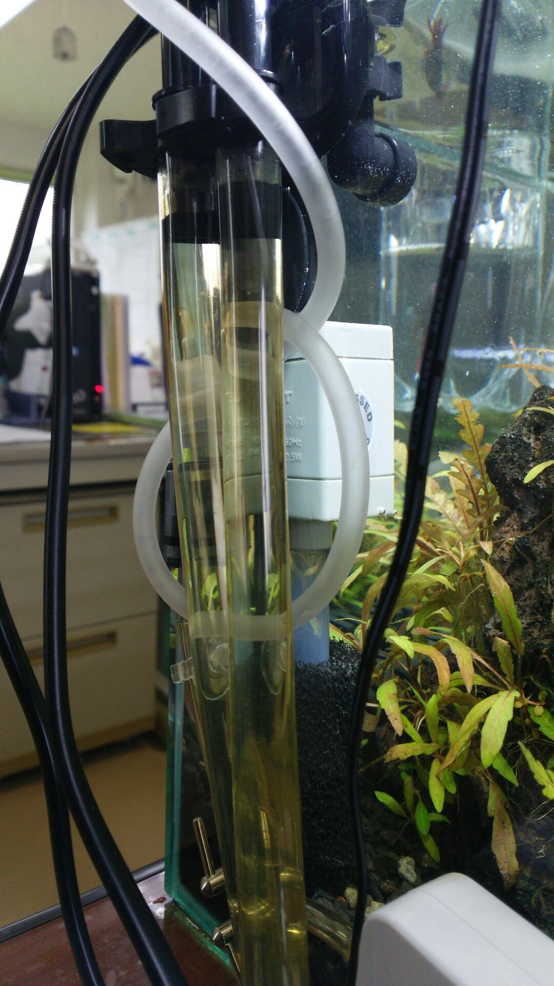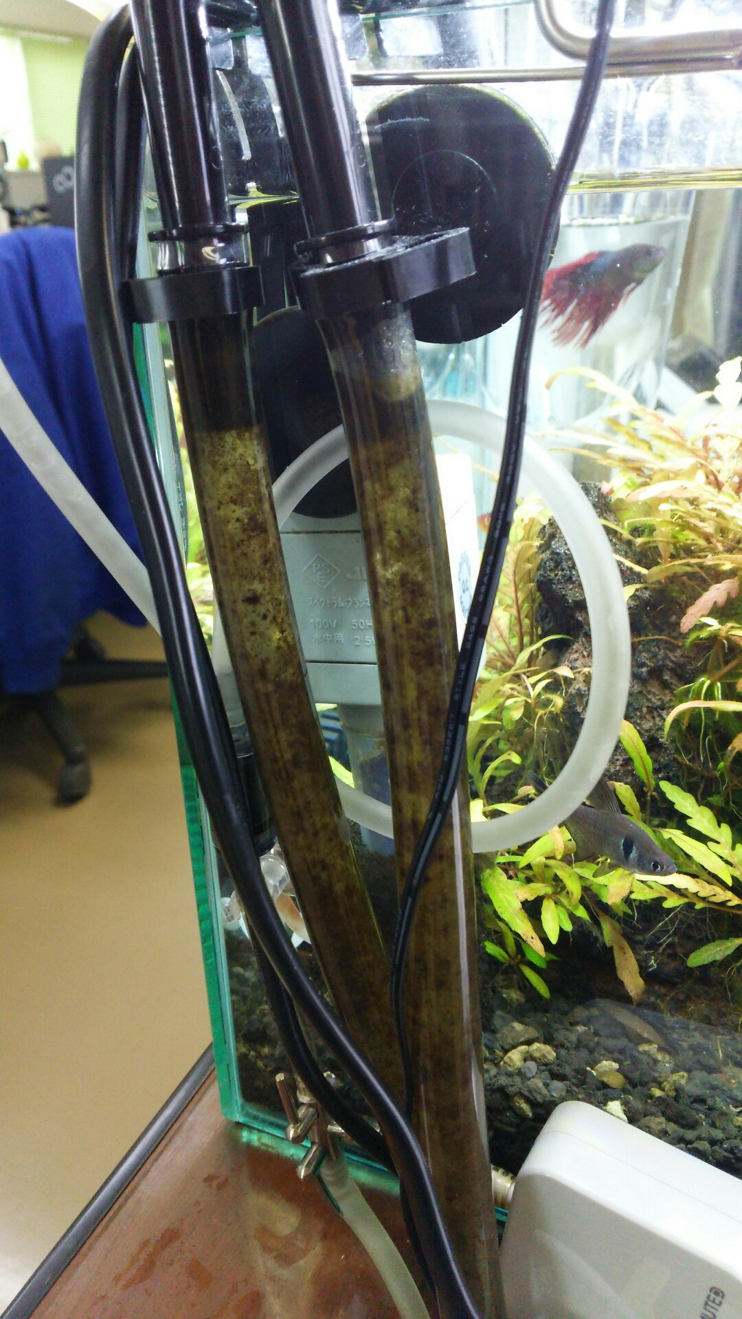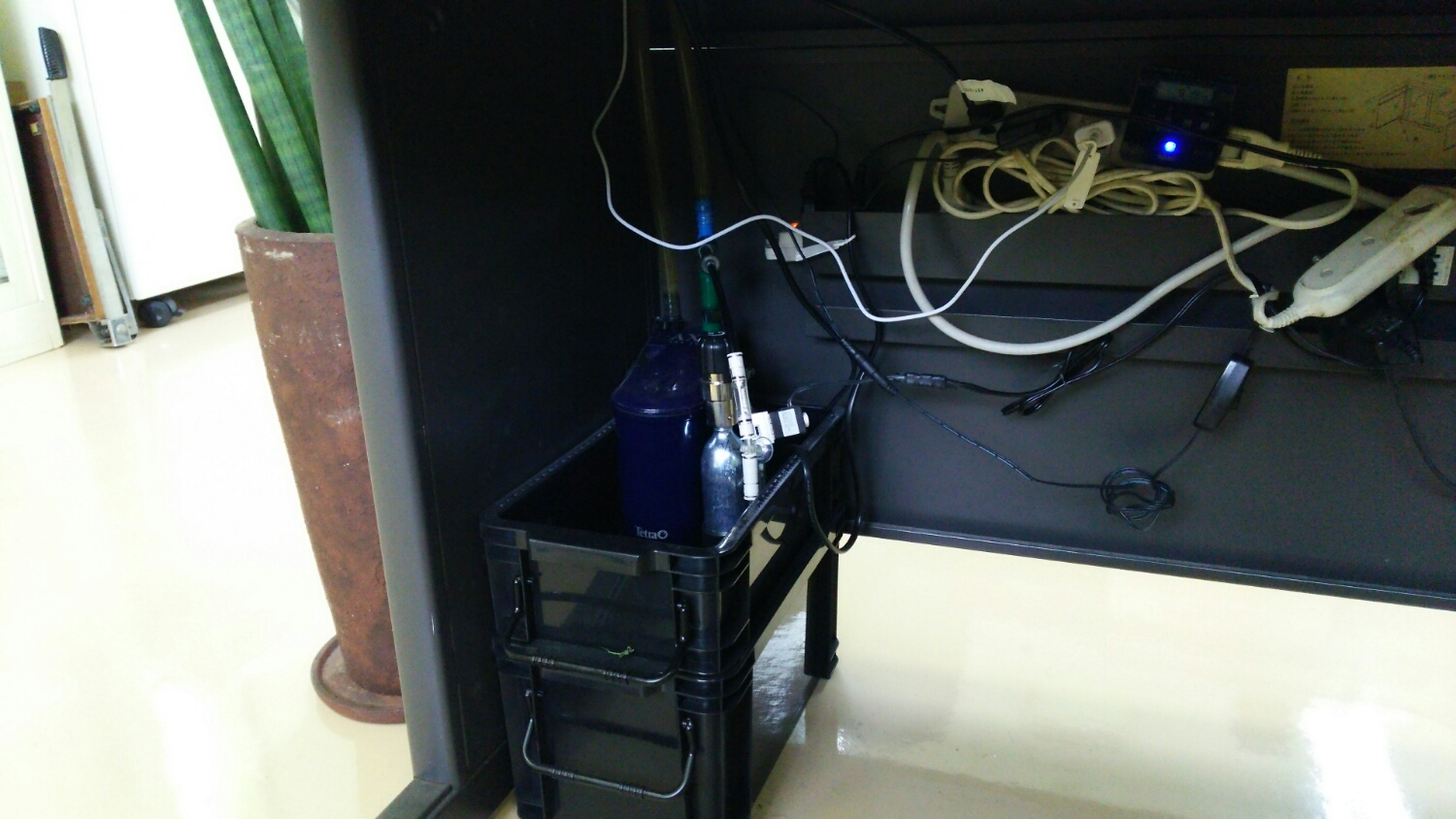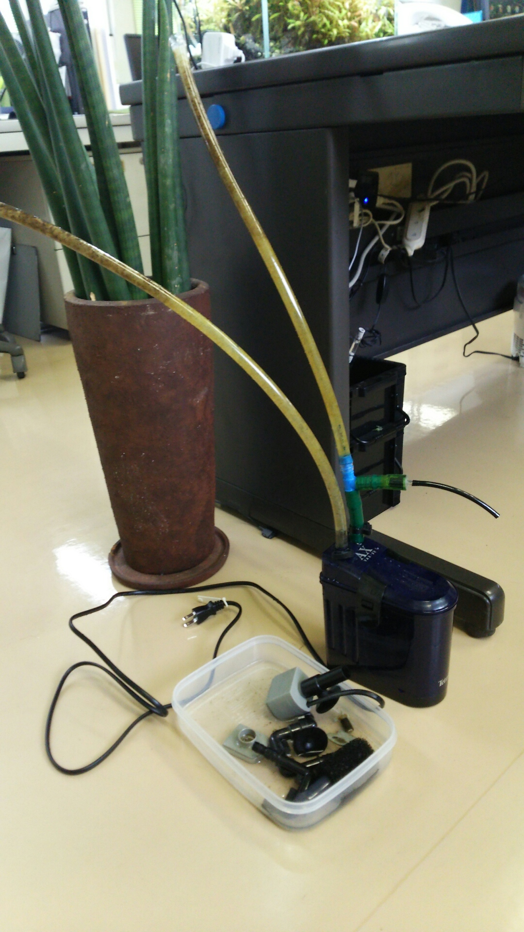 フィルターが置いてあるのは、デスクの下。水槽の下。