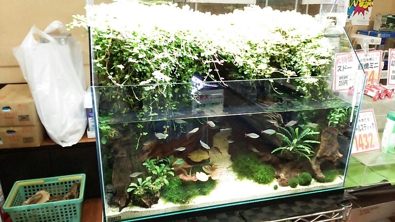 それを隠すように、流木やら気孔石やら水草を配置してあって、見応えありました!