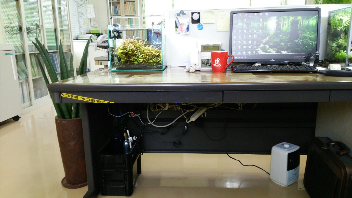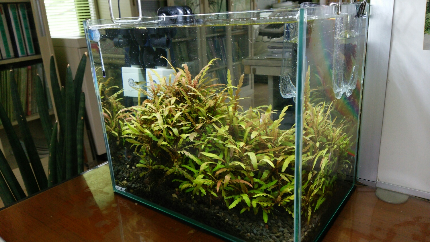 フィルターが置いてあるのは、デスクの下。水槽の下。
