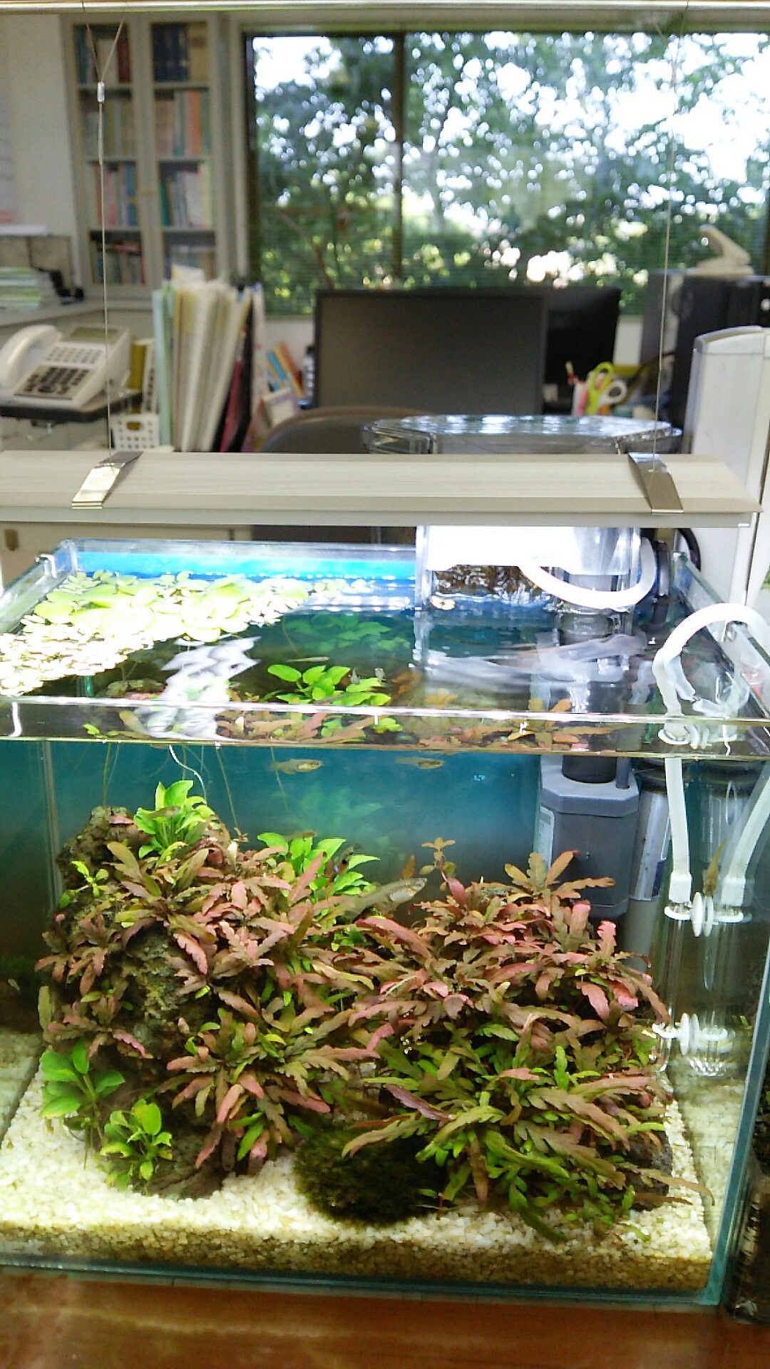 続いて、自分のデスクにある30cm水槽を覗きこむ。
