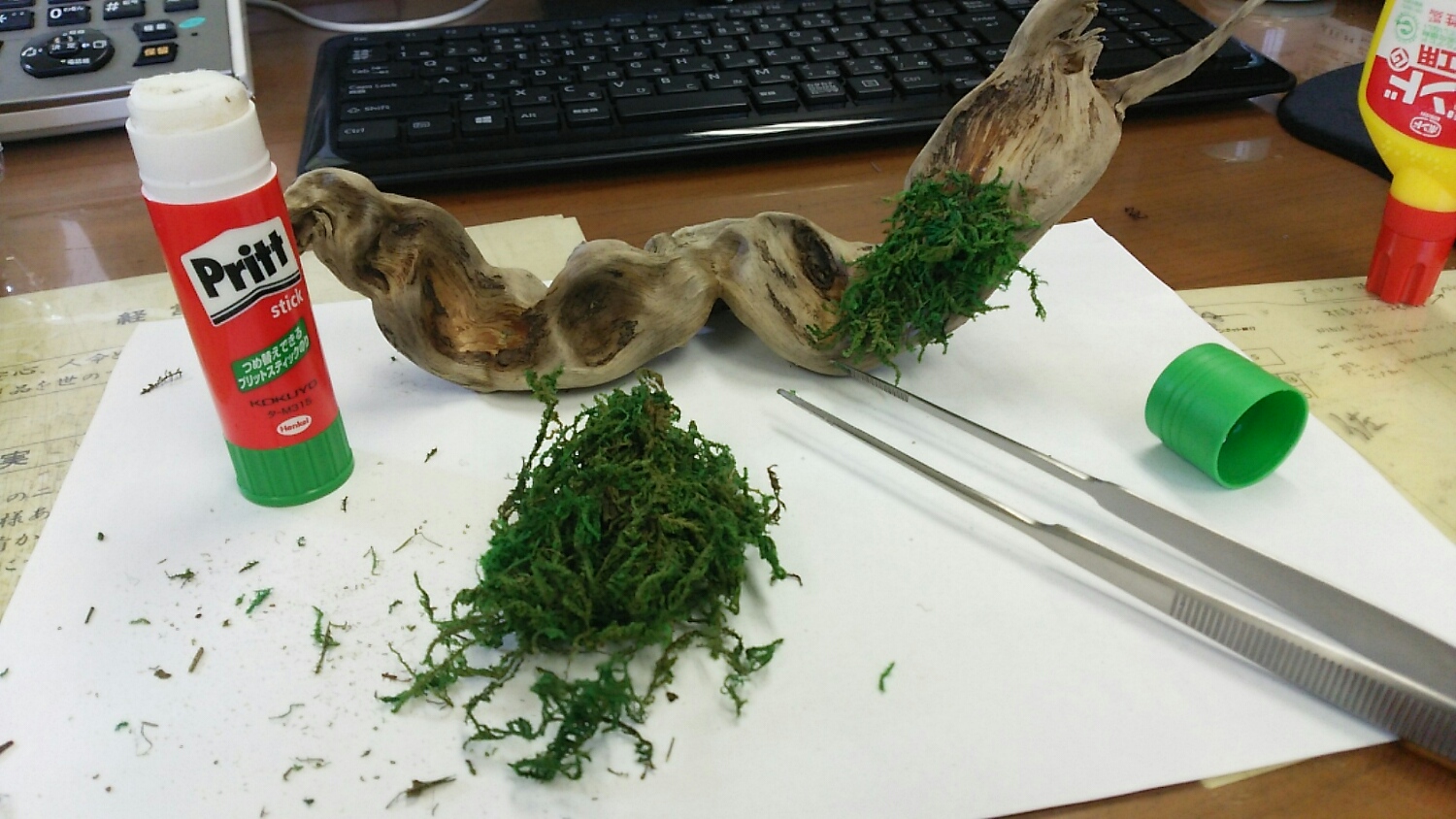 前回は無造作に貼り付けちゃいましたけど、今回はモスが活着してる風にしようと思い、下から少しずつ貼り付けていきます。